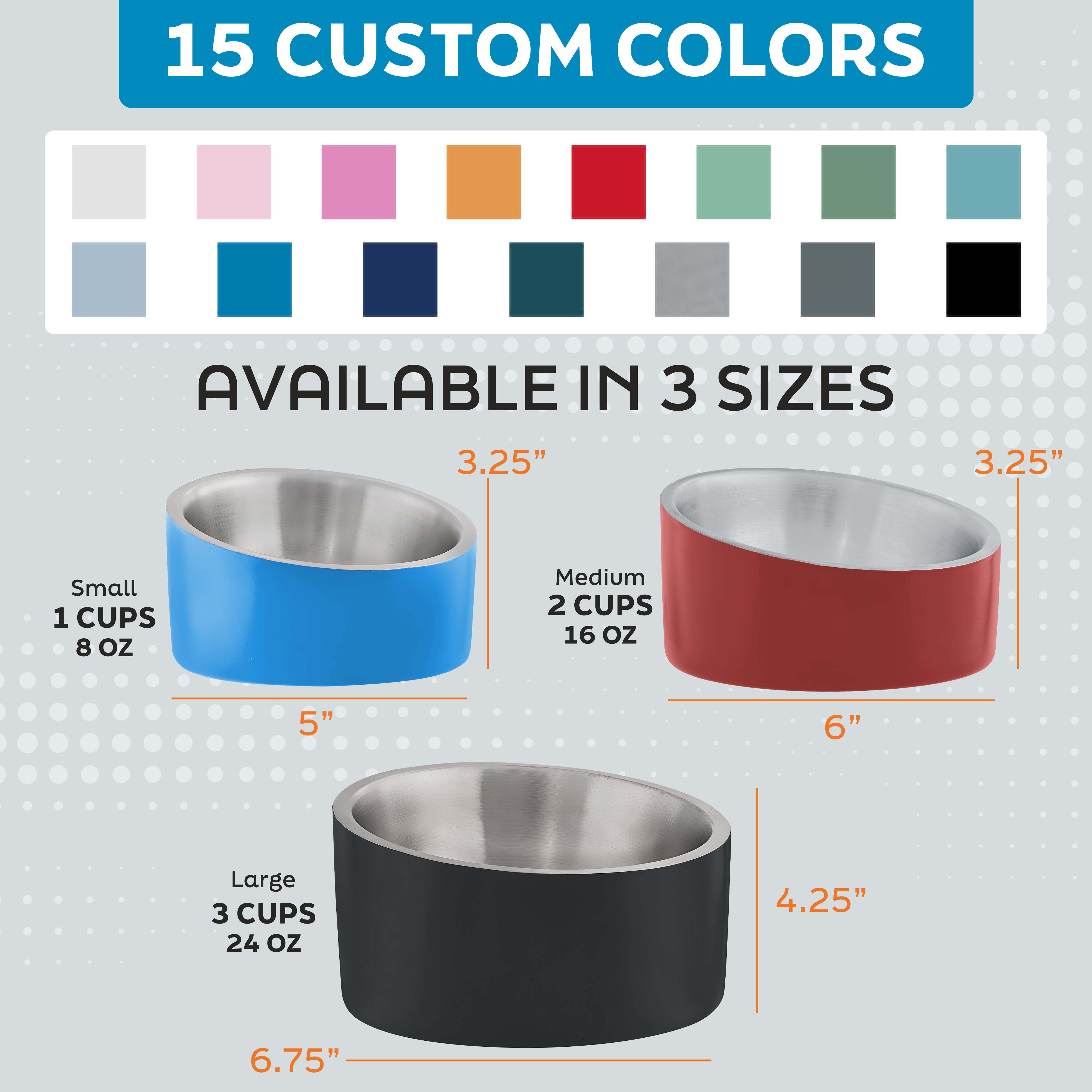 - Stay Cold Cat or Dog Food Bowl: Approximately 1 cup (8 oz) capacity water bowl for dogs, cats and pets. Metal dog cat water bowl in small, medium, large sizes. Elevated angle and tilt may help reduce neck strain and improve digestion.